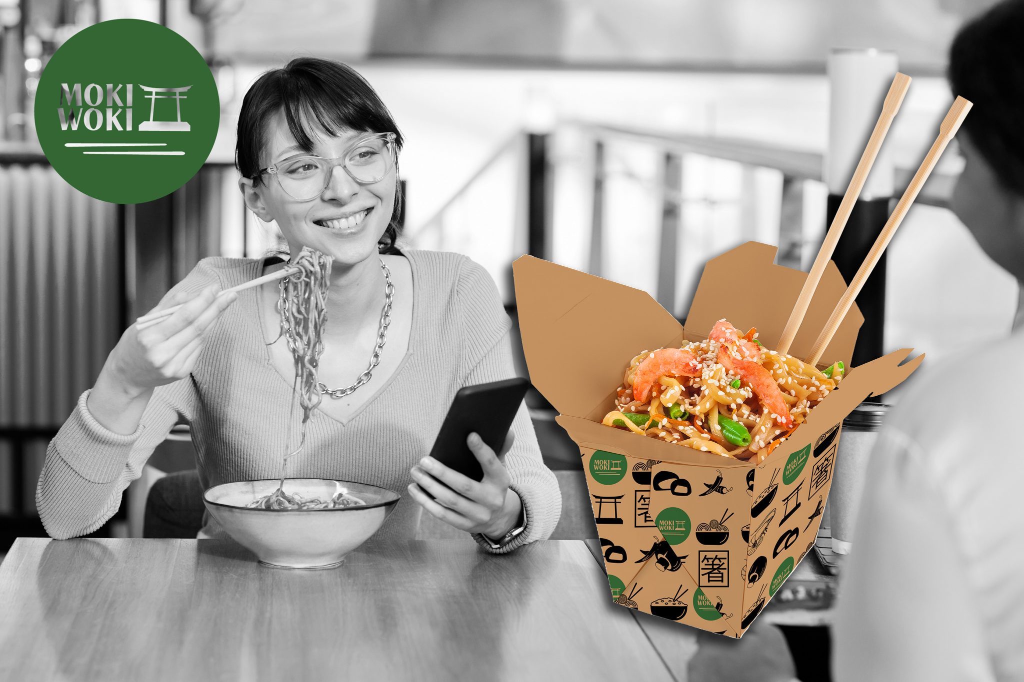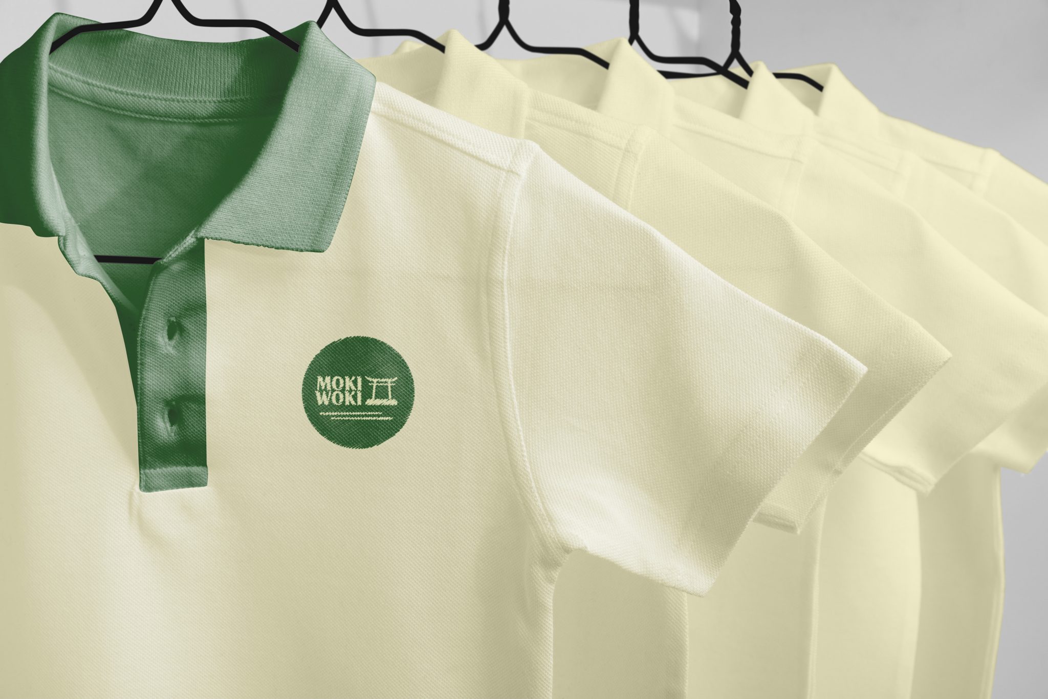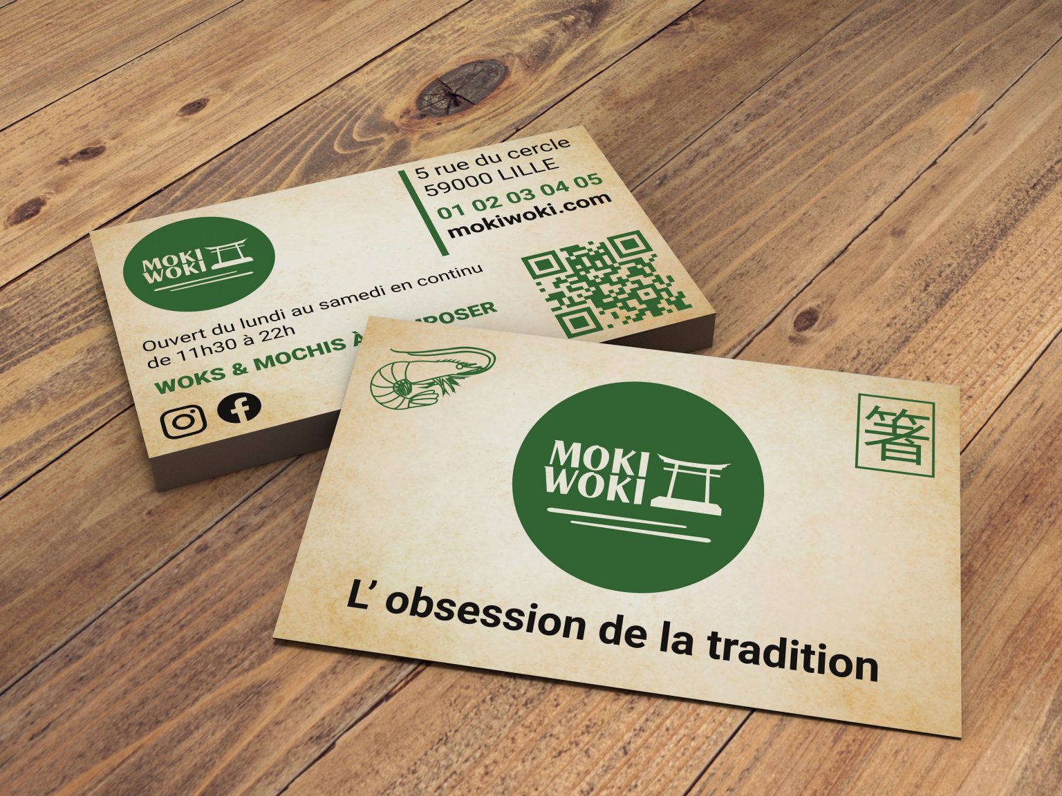 Je crée pour Moki Woki, l'identité visuelle comprenant le logo, la charte graphique, la carte de visite et les illustrations. Je crée aussi le menu du restaurant, le packaging des woks, les polos de l'équipe du restaurant et l'enseigne.