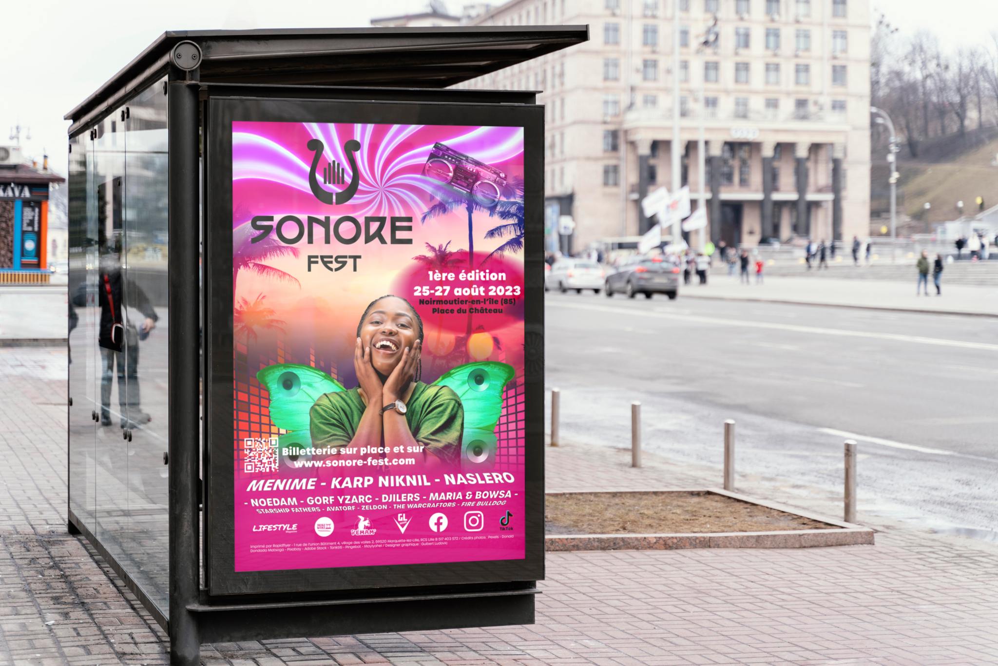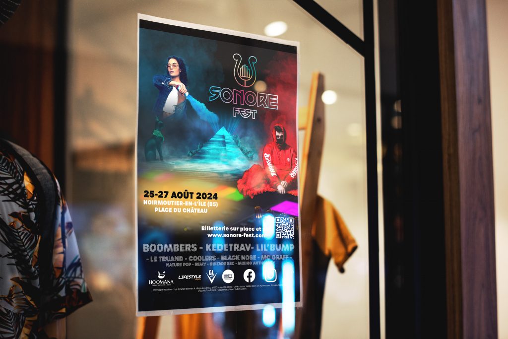 Je crée pour Sonore Fest, l'identité visuelle comprenant le logo, la charte graphique. Je crée aussi les affiches des 2 premières édition et les goodies.